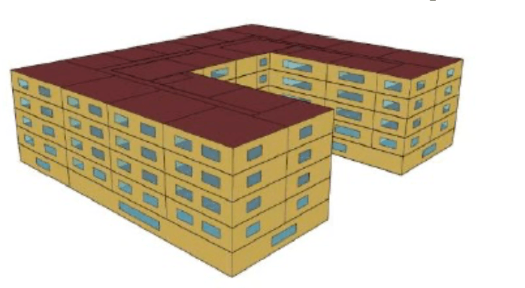 The small office building model is a single-story rectangular building of 5,500 square feet. It has punched windows and a hipped roof with an attic. There are five zones, each served by packaged single-zone air conditioner units. For more details refer Appendix 3A. This prototype is used for simple geometry test cases only.